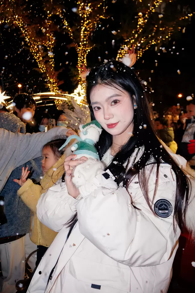 肤色呈现出自然的暖调红润感,搭配圣诞主题的红色毛衣,衣服的正红色和背景里彩色针织圣诞树的色彩层次分明,不用懂“色彩搭配”,R100 的色彩调校会帮你把人像和场景氛围完美融合。