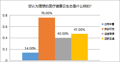 调研对象中,76%认为安全可控就是理想的云生态;47%认为云生态内部需要互联互通,从业务到数据都要整合实现协同服务;40%认为越来越丰富的云应用需要简化操作,因此运维简便也是一个医疗健康云生态的重要属性;14%认为云生态上需要有丰富的应用,如果能够在一朵云上获得大部分应用,应用管理就会变得无比简单。