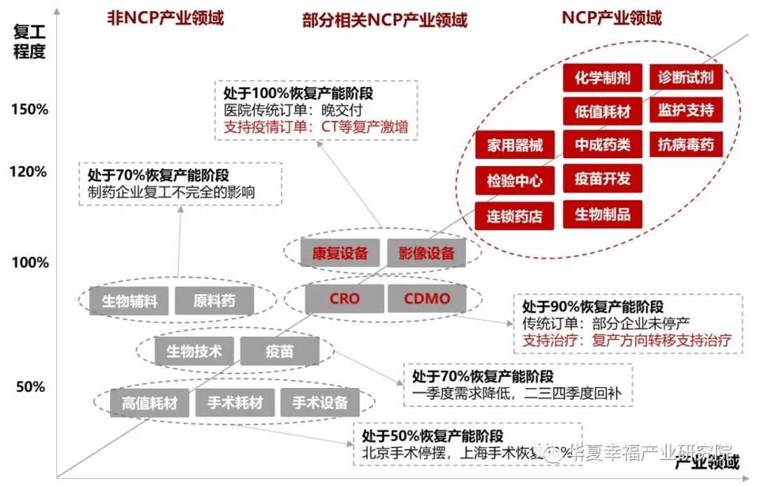 疫情下的生物医药领域,一季度产业复工复产分化严重:NCP医药产业领域需求激增下的复产增产“逆势飞扬”,部分业务与NCP相关的企业受疫情拉动,复产业务多转为抗疫相关产品,而非NCP相关的医药领域受疫情影响,需求暂缓,并未完全复工复产。