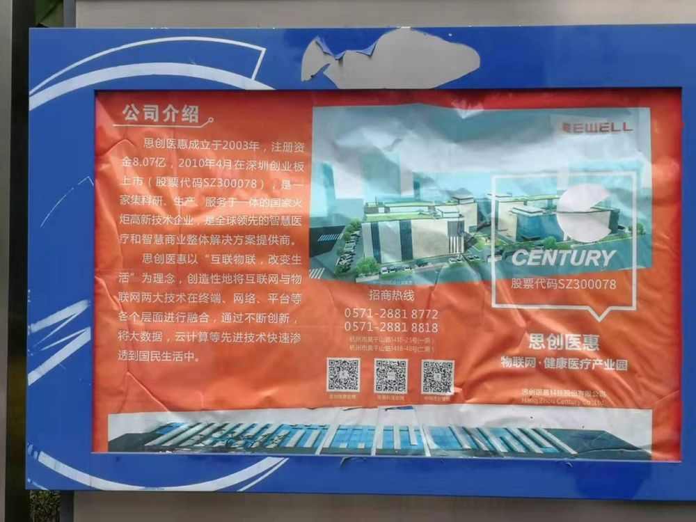 杭州城北近郊莫干山路1418-25号园区内,略显残旧,快递小车进进出出,办公楼进口处打着“思创医惠产业园热烈欢迎您”,而旁边的招商告知牌则告知外界,园区正在发生变迁。