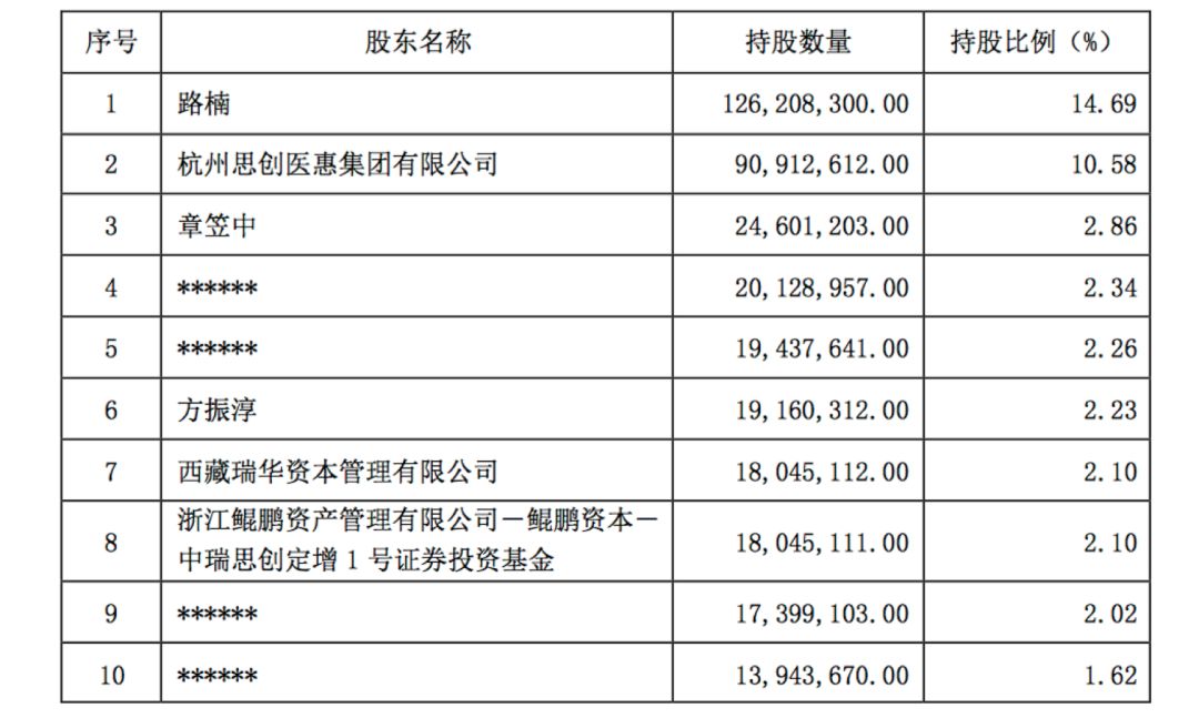 思创医惠相关人士告诉财联社记者,当时认购非常火爆,方振淳、西藏瑞华资本、鲲鹏资产管理有限公司—鲲鹏资本—中瑞思创定增 1 号证券投资基金不仅以50元/股的高溢价,耗费6亿元资金成为股东,也同意和路楠结成了一致行动人。