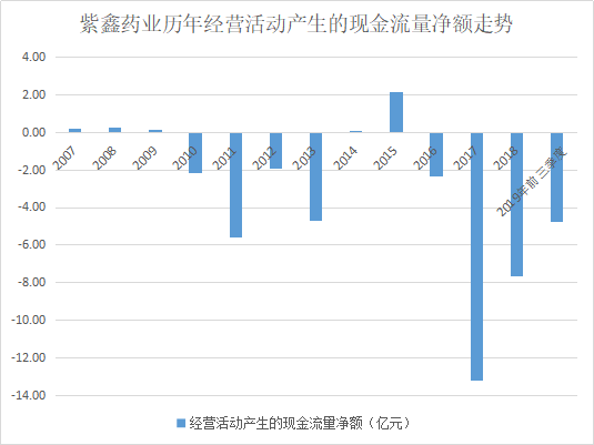 事实上,自上市以来,紫鑫药业的经营性现金流就处于不断流出的状态。2007年到2019年前三季度,近13年时间里,公司仅有4年时间出现微幅净流入的现象,其余年份均为外流。据财报,自2007年以来,紫鑫药业经营活动产生的现金流净额为-39.53亿。下图为红岸研究中心根据财报绘制的紫鑫药业历年经营活动产生的现金流量净额走势: