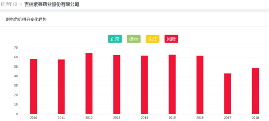 在公司账面盈利,现金流却不断流出的背景下,紫鑫药业的财务压力不断加重。事实上,据红岸风险挖掘系统显示,自2010年以来,紫鑫药业的财务一直处于高危状态。2010年—2018年,其财务危机得分均为风险级。下图为红岸研究中心对红岸系统中紫鑫药业财务危机得分变化趋势的截图:
