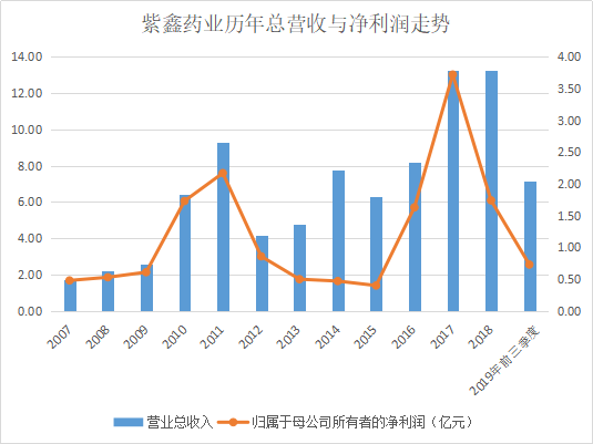 不过,即便是业绩暴跌,公司仍为盈利状态。事实上,自2007年上市以来,紫鑫药业净利润虽曾出现起伏,但从未亏损。据财报,2007年—2019年9月底,公司净利润总和达15.57亿。下图为红岸研究中心根据财报绘制的紫鑫药业历年总营收与净利润走势: