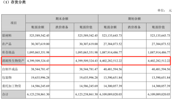 紫鑫药业的存货主要为原材料、库存商品、消耗性生物资产等,其中,消耗性生物资产所占的比重较大。据2019年中报显示,截至今年6月底,公司消耗性生物资产为43.99亿,消耗性生物资产占其存货的比重高达71.84%。下图为紫鑫药业2019年中报的截图: