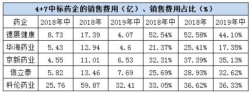 在去年12月的4+7城市药品集中采购中,有5家公司中标产品反映在中报中。今年中期,德展健康和华海药业销售费用占比同比明显下降,京新药业、科伦药业环比下降,只有信立泰同比和环比仍在上升。