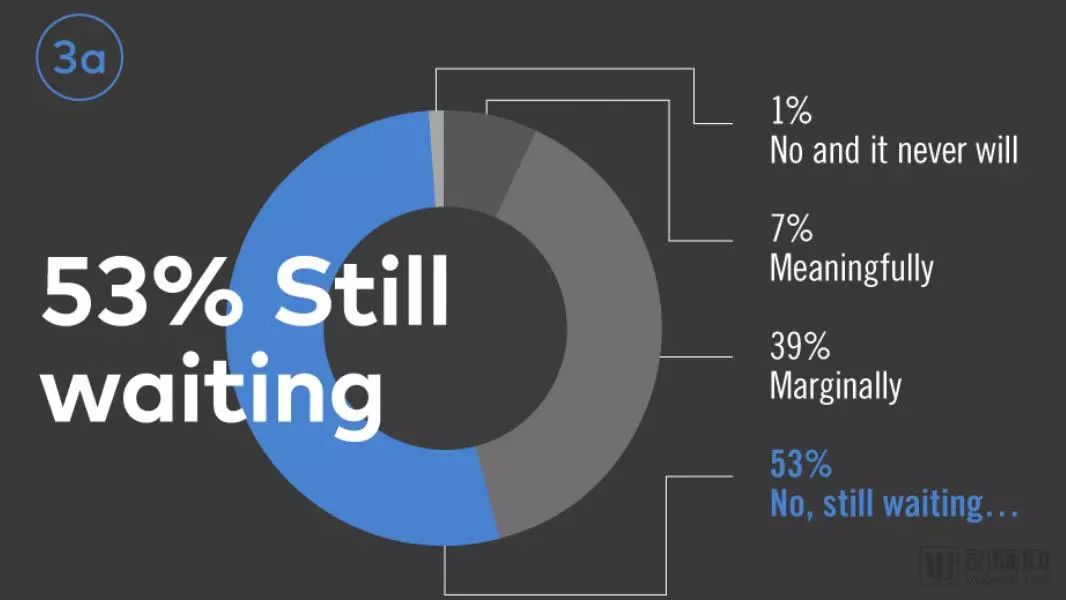 但这并不意味着人工智能已经被普遍接受了,受访者仍然在等待它能有进一步突破,只有7%的受访者认为人工智能对于医疗保健领域已经产生重大影响。