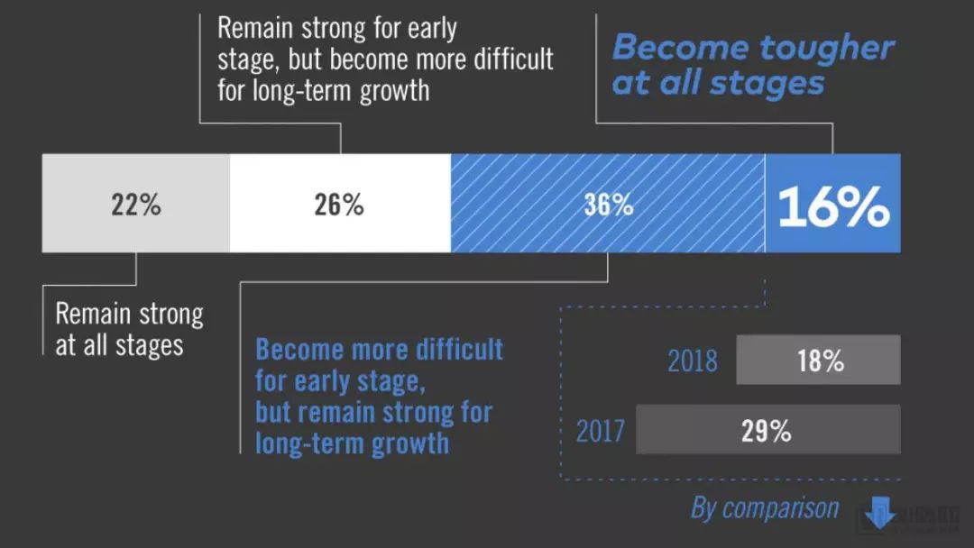 其次,对于投入医疗科技公司的资本变化,250名受访者态度不一。22%的受访者认为资本在各个阶段都将保持强势增长;16%受访者持相反意见,认为资本在未来的增长十分困难;其他受访者的态度介于前两者之间,他们认为投入的资本总额将会略有上升,但在不同阶段会不断波动。
