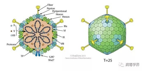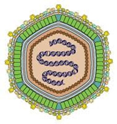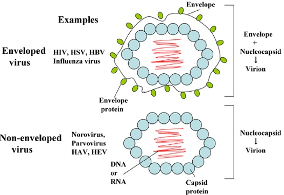在典型的情况下,有囊膜病毒最外侧是囊膜和一到多种囊膜蛋白,囊膜之下为衣壳蛋白组成的衣壳(Capsid),衣壳里面是病毒核酸和其它蛋白;而无囊膜病毒最外侧为衣壳蛋白组成的衣壳,衣壳里面是病毒核酸和其它蛋白。