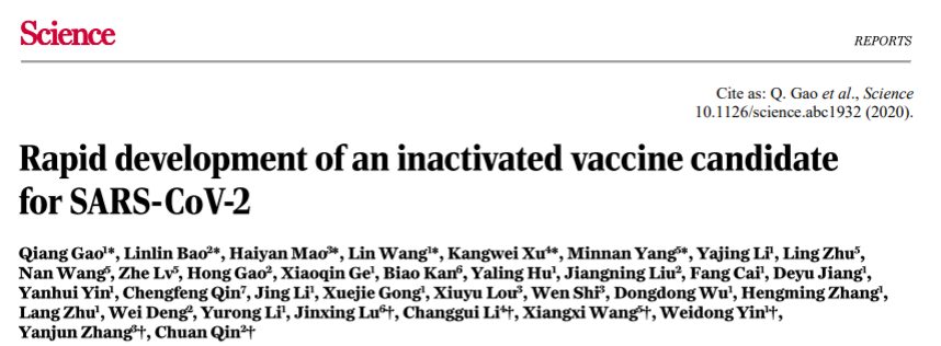 2020年5月6日,中国医学科学院医学实验动物研究所秦川团队、科兴控股生物技术有限公司、中国科学院生物物理研究所王祥喜团队、浙江省疾控中心张严峻团队、中国食品药品检定研究院、中国疾病预防控制中心传染病预防控制所等多家单位合作,在 Science 上发表了题为:Rapid development of an inactivated vaccine candidate for SARS-CoV-2的研究论文。这是首个公开报道的新冠疫苗动物实验研究结果。该研究已于2020年4月20日发布在生物预印本 bioRxiv 上。