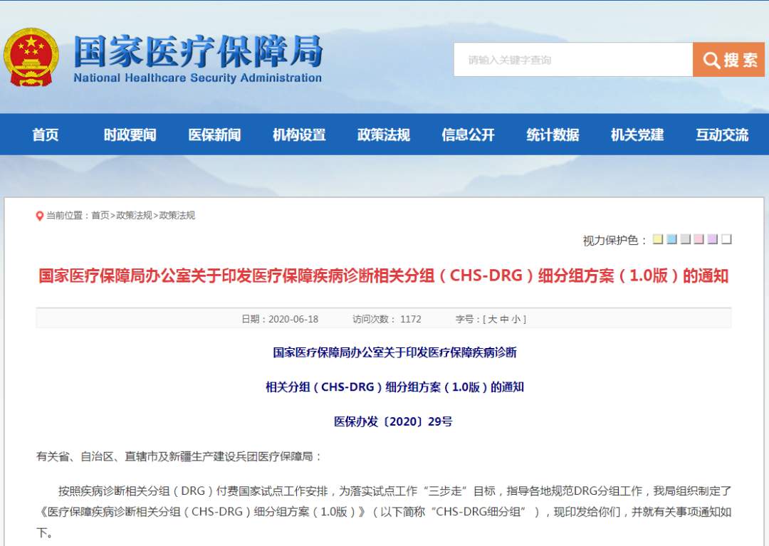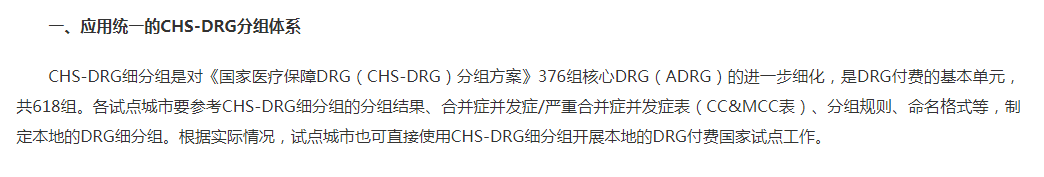 早在2019年10月国家医保局就印发了《关于印发疾病诊断相关分组(DRG)付费国家试点技术规范和分组方案的通知》正式公布了《国家医疗保障DRG分组与付费技术规范》(以下简称《技术规范》)和《国家医疗保障DRG(CHS-DRG)分组方案》(以下简称《分组方案》)两个技术标准。