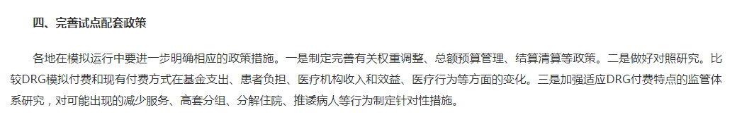 各地在模拟运行中要进一步明确相应的政策措施:①制定完善有关权重调整、总额预算管理、结算清算等政策。②做好对照研究。比较DRG模拟付费和现有付费方式在基金支出、患者负担、医疗机构收入和效益、医疗行为等方面的变化。③加强适应DRG付费特点的监管体系研究,对可能出现的减少服务、高套分组、分解住院、推诿病人等行为制定针对性措施。