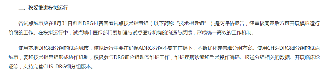 “各试点城市应在8月31日前向DRG付费国家试点技术指导组(以下简称“技术指导组”)提交评估报告,经审核同意后方可开展模拟运行阶段的工作。”本次方案还强调模拟运行中要不断优化完善细分组方案,DRG付费模式改革正式步入正轨。