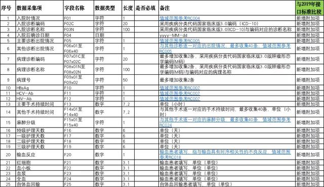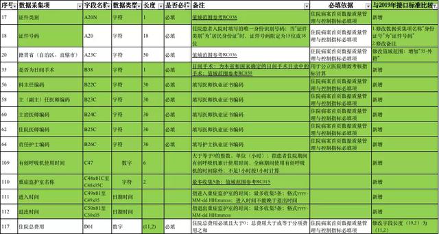 我们重点看新增的内容:主要包含了证件类别、证件号码、籍贯省、是否为日间手术、科主任编码、主(副主)任医师编码、主治医师编码、住院医师编码、责任护士编码、有创呼吸机使用时间、重症监护室名称、进入时间、退出时间、住院总费用。填写及与2019年接口标准对比如下: