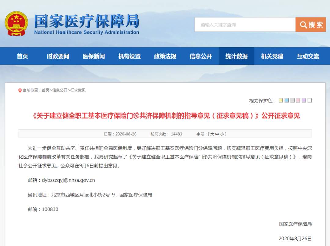 2020年8月26日,国家医保局发布《关于建立健全职工基本医疗保险门诊共济保障机制的指导意见(征求意见稿)》,公开向社会征求意见。