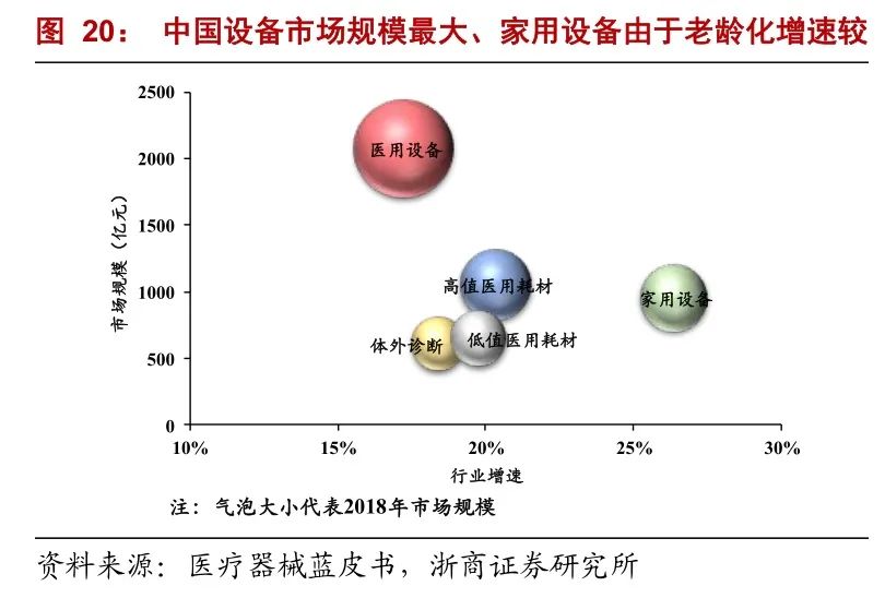 从市场规模来看,医用设备规模最大,低值耗材和体外诊断相对较小;从行业增速来看,家用设备受益于老龄化、医疗消费升级而呈现高增速。