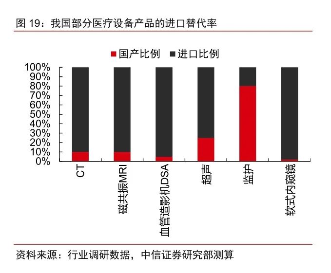 此外,我国医疗器械产业起步较晚,虽然在一些中低端领域已经占据大部分市场,但是在技术、品牌、渠道、服务等方面竞争力较弱,高端市场仍由外资企业占据,内窥镜、超声、MR、CT 等产品在上海二级以上医院国产化率不足 20%。