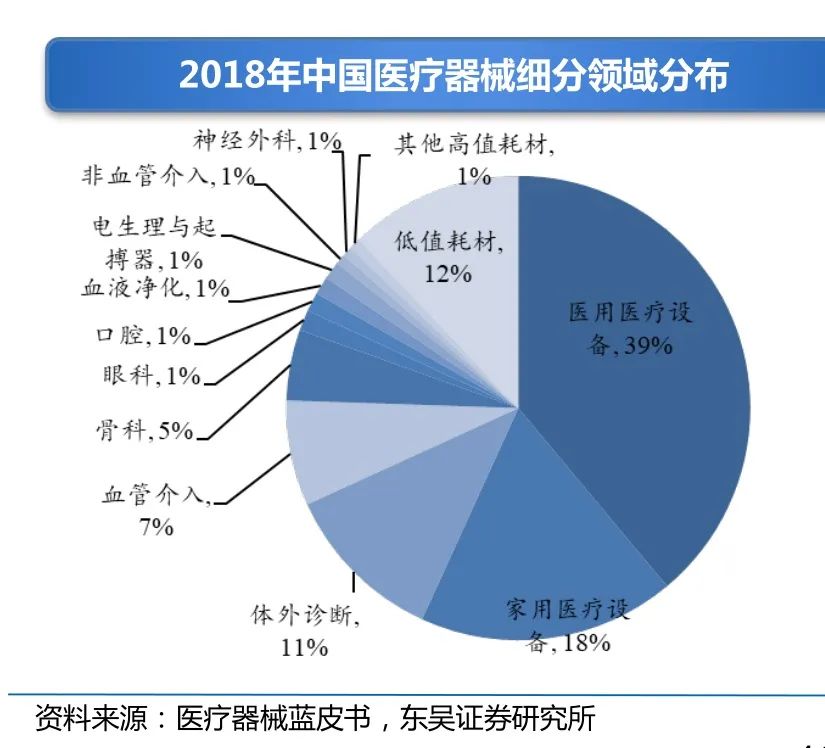 中国医疗器械行业中,医疗设备占据50%以上市场份额,其中医用医疗设备占据了39%,另外耗材类体外诊断、血管介入、骨科、眼科、口腔等医用耗材领域也均占据一定市场份额。随着中国医疗消费水平的提升,各细分领域均有望诞生一批优质成长性公司。