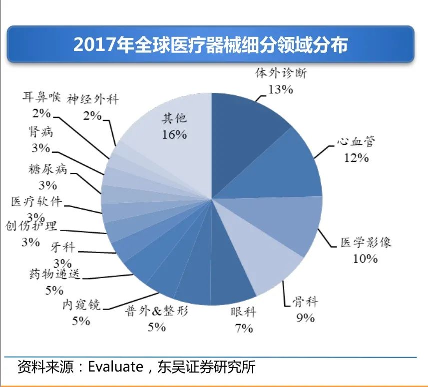 全球医疗器械行业中,前五大领域体外诊断、心血管、医学影像、骨科和眼科分别占据13%、12%、10%、9%和7%,每个领域中都诞生了多个优质成长股。
