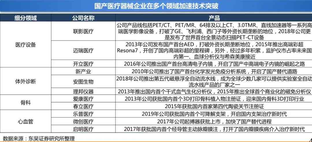联影医疗、开立医疗、新产业、安图生物、理邦仪器、爱康医疗、春立医疗等都在各自细分领域进行国产替代。