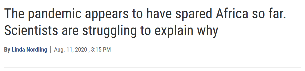 2020 年 8 月 11 日,Science News 上的一篇题为:The pandemic appears to have spared Africa so far. Scientists are struggling to explain why 的报道性文章对这一情况进行了描述和分析。
