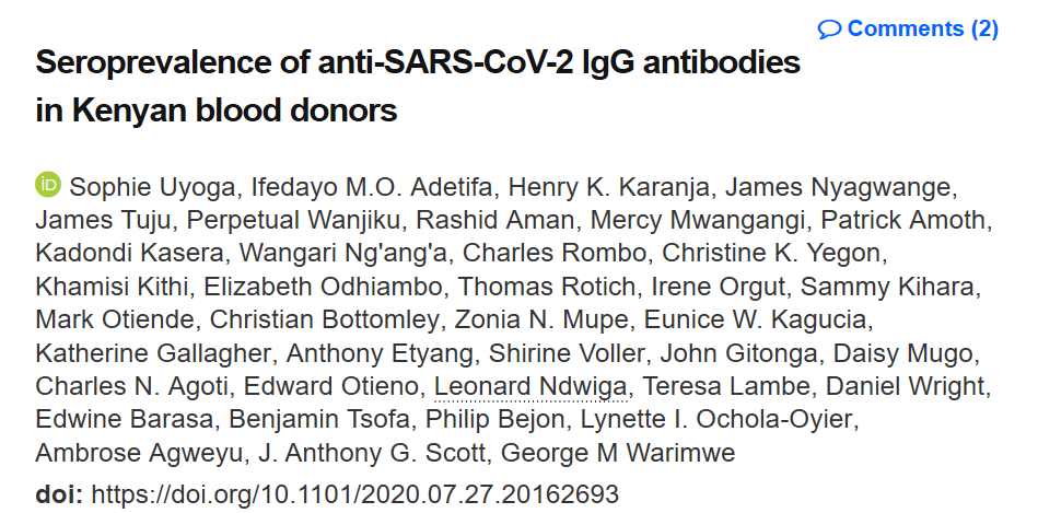 7 月 27 日,Sophie Uyoga 等在预印本平台 medRxiv 上发表题为:Seroprevalence of anti-SARS-CoV-2 IgG antibodies in Kenyan blood donors 的研究论文。