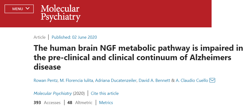 Pentz,R., Iulita, M.F., Ducatenzeiler, A. et al. The human brain NGF metabolicpathway is impaired in the pre-clinical and clinical continuum of Alzheimersdisease. Mol Psychiatry (2020). https://doi.org/10.1038/s41380-020-0797-2