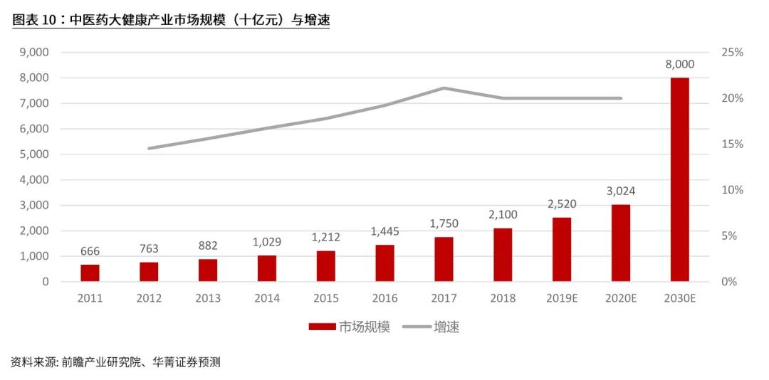 受国家政策引导以及大健康产业的蓬勃发展,中医药行业发展迅猛。根据前瞻产业研究院统计数据,2011 年-2017年,我国中医药大健康产业的市场规模由6,658亿元增加到17,500亿元,CAGR 为17.5% ;预计到2020年,产业规模有望突破3万亿元。根据2016年颁布的《中医药发展战略规划纲要(2016-2030) 》,2030年中医药产业规模高达8万亿元,2016-2030 年CAGR为10.3%。2016年8月,国家中医药管理局颁布《中医药发展“十三五”规划》,预计到2020年,中医总诊疗人次数将达到13亿(比2016年增长44.4%), 助理类医师数量有望达到70万人(比2016年增长55.6%)。