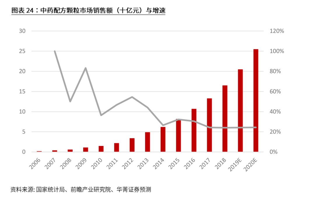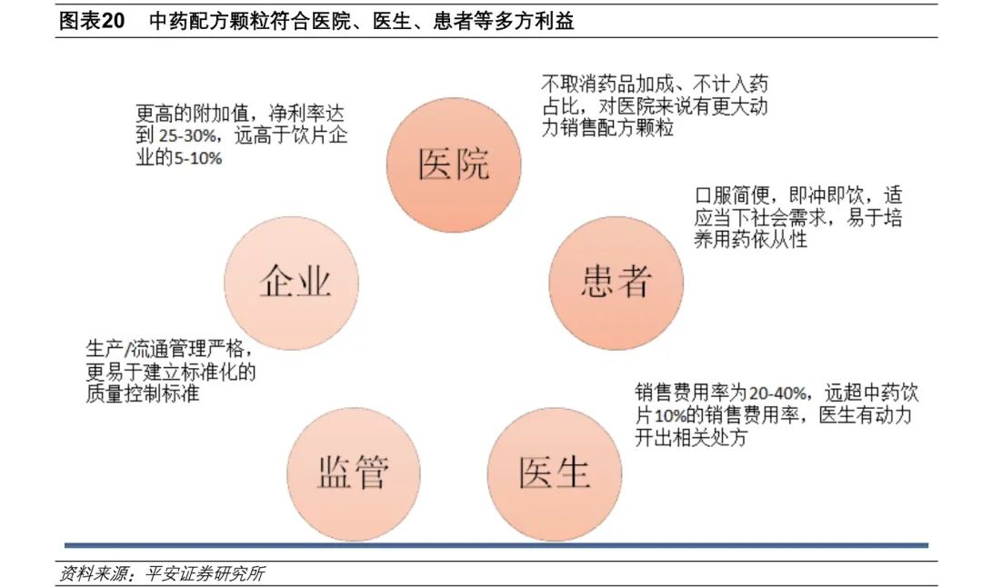 中药配方颗粒适应现代生活节奏,服用方便,有助于培养用药依从性;不取消药品加成、不计入药占比,净利率达到 25-30%;同时也易于标准化、规范化,更利于监管。过去十年复合增速近 50%,在行业逐步放开的趋势下配方颗粒将部分替代中药饮片和中成药,未来有望达到 40%的复合增速。