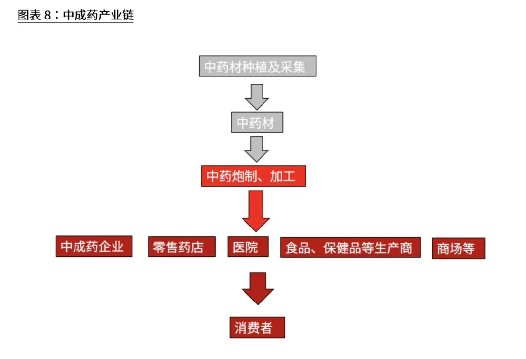 中药产业链是指从中药材种植,到中药产品的生产加工过程,最后到达终端消费者,包括.上游中药种植、中游中药加工、下游中药流通等环节。中药材作为生产原料,是中药产业发展的基础,中药饮片和中成药生产是中药产业的核心。