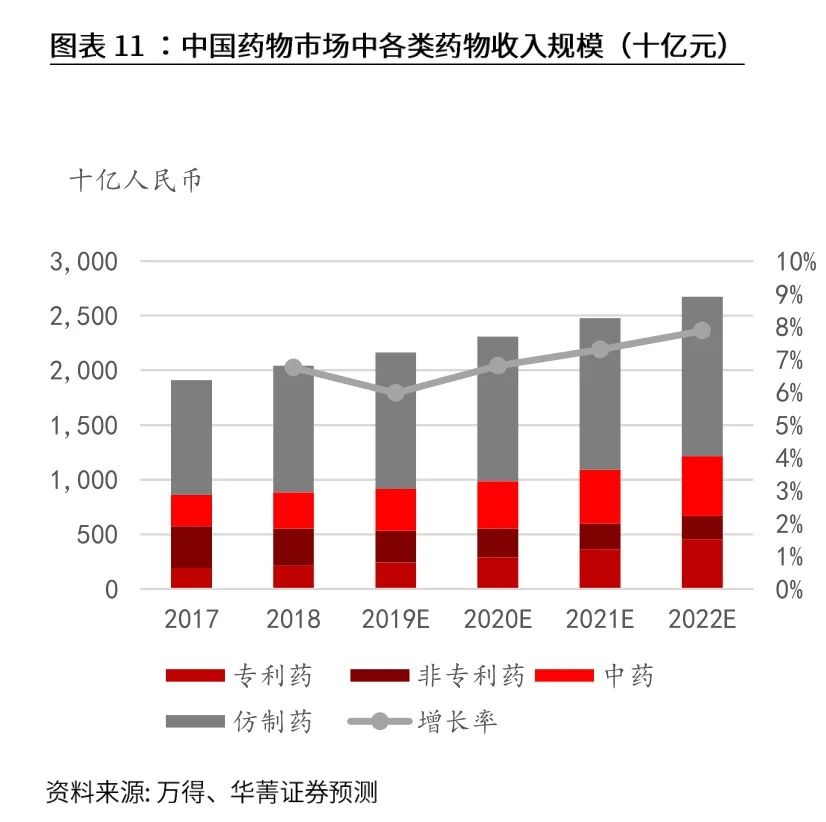 中药在国内药物市场占比为15%左右,排名第二。中成药未来在我国的医药临床终端中的占比可能在10-15% 左右,市场规模在2000-3000亿左右。