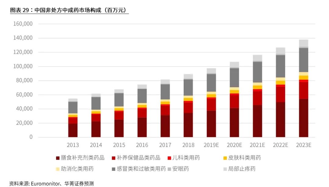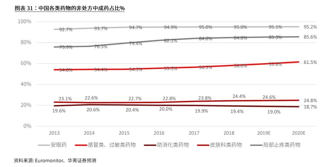 中成药在部分领域优势明显。根据Euromonitor数据,中成药在部分领域拥有明显优势。按照各类药物的OTC-中成药占比来看,安眠用药以中成药为主,中成药占比近5年来维持在90%以上,2018年为95%。在局部止疼类与感冒类过敏类药物领域中成药占比在逐年上升,2018年占比分别达到84.8%和58.0%。中成药在消化系统疾病用药领域和皮肤科用药占比较少,2018 年占比分别为19.4%和24.4%,该两类药物还是以西药为主。
