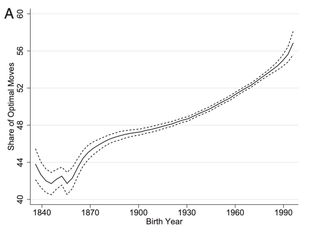 同时,研究人员还发现,对于后来出生的棋手,他们认知能力的表现要显著高于 1870 年出生的棋手。例如,1870 年代,棋手的动作与计算机动作的吻合率在 44% 左右,而 1960 年代,棋手的动作与计算机动作的吻合率已经达到了 50%,到了 1990 年代棋手的动作与计算机动作的吻合率甚至超过了 55%。