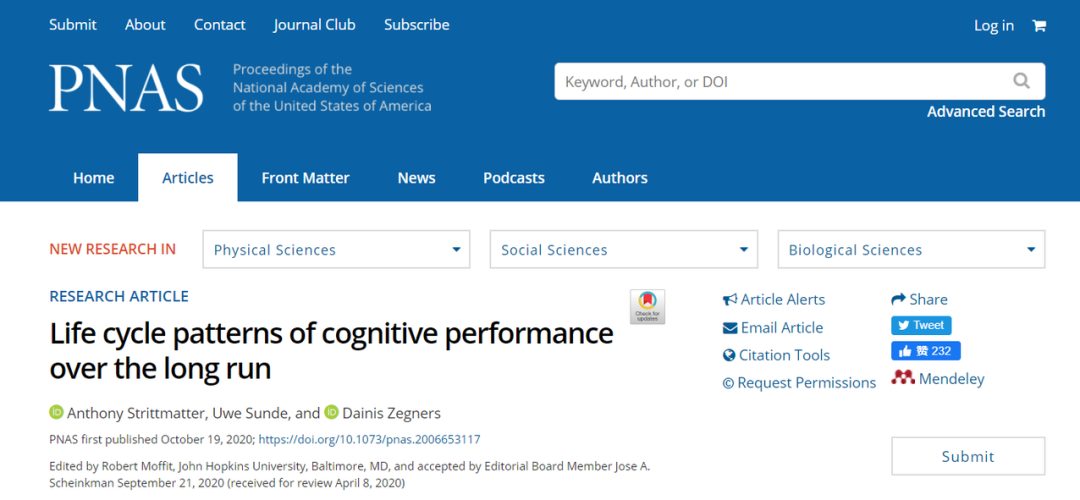 相关研究论文以“Life cycle patterns of cognitive performance over the long run”为题,于 10 月 19 日发表在《美国国家科学院院刊(PNAS)》上。