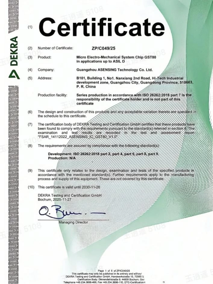 在MUNIK秒尼科的专业技术支持服务下,近日导远科技研发的微机电(MEMS)芯片GST80正式获得DEKRA德凯颁发的ISO 26262功能安全产品认证,达到ASIL D最高安全等级要求。这是首款获此认证的国产车规级惯性测量单元(IMU)芯片,标志着我国在性能与安全并重的车载传感器芯片领域实现重要突破。