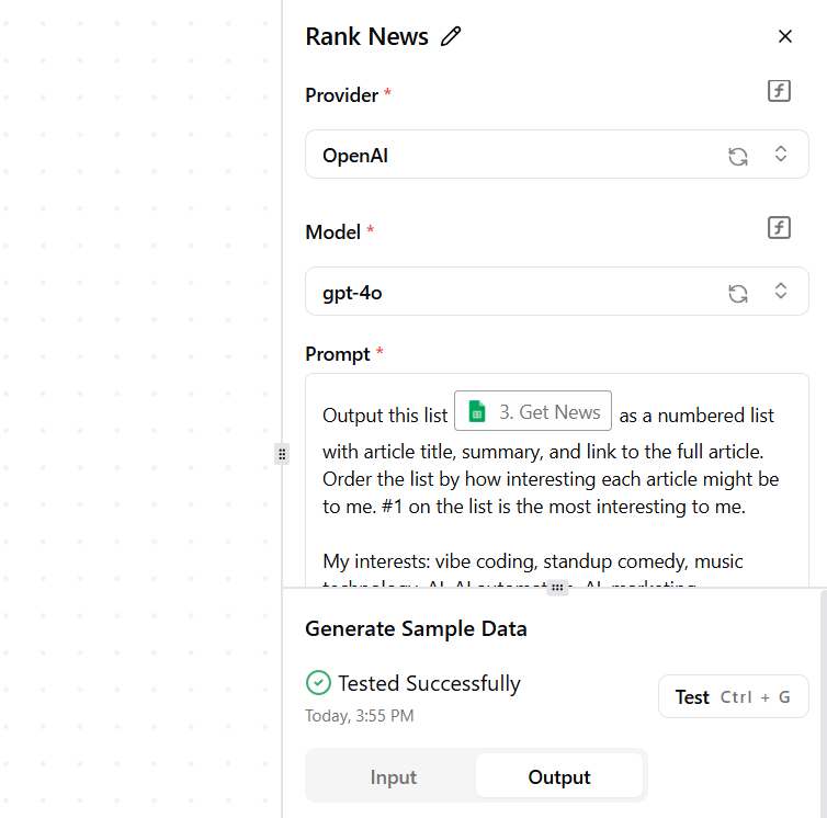 以"rank news"模块为例,该模块通常用于对新闻内容进行智能排序或分类处理,在此场景下,需选择AI模型并输入API密钥。例如,可从 OpenAI平台获取API密钥,系统已预配置提示词模板供直接使用。