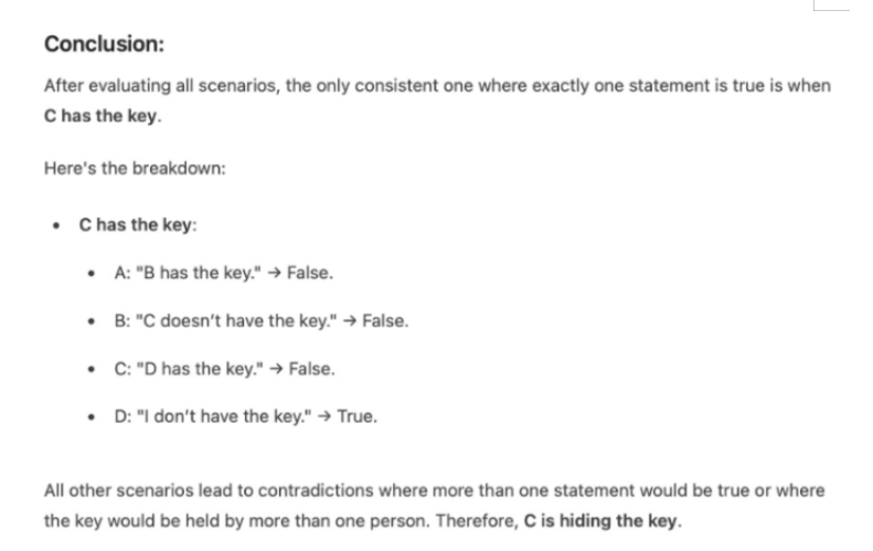 这个模型准确地解开了谜题,并采用了逐步推理的分析方法。通过逐一排查各种可能情形,最终得出结论,确定C私藏钥匙。不过,在响应时间上出现了较为明显的延迟:80亿参数版本耗时约40至50秒才得出结果。这一延迟很可能由于本地硬件性能的限制,而非模型本身的推理效率问题。