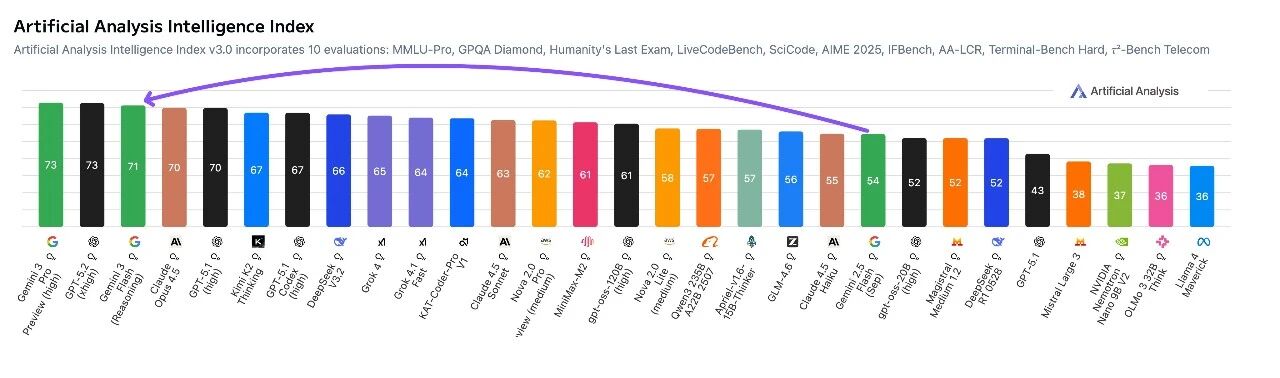 从基准测试来看,Gemini 3 Flash 相比前代有着断崖式提升,在多项核心指标上,已经逼近甚至超过 Gemini 3 Pro 与 GPT-5.2 等前沿模型。