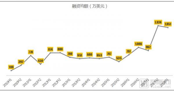 2018H1,国内医疗健康行业融资均额小幅回落,为1851万美元。而相较于近年融资均额,2018H1融资均额已有长足增长。