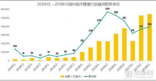 2018H1,国内医疗健康行业共发生融资事件295起,同比仅增长7%,未达到2015、2016年鼎盛时期的水平。