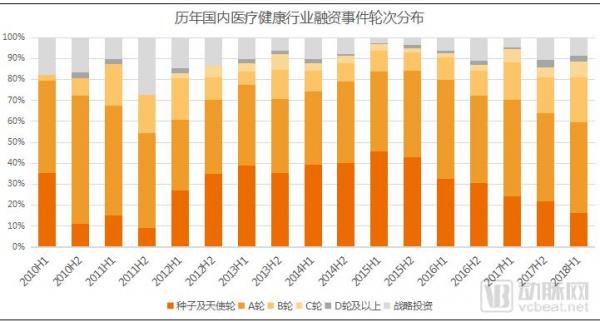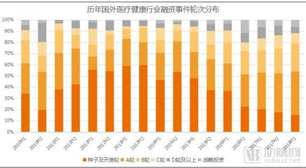 对比历年国外医疗健康行业的融资轮次分布,可以发现,2018H1种子及天使轮、A轮项目占比持续降低,达近三年最低,为45%。