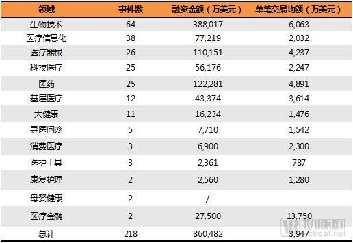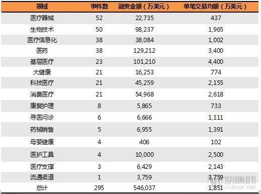 医药、基层医疗、生物技术领域吸金最多,医疗器械、医疗信息化领域表现突出