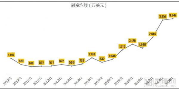 2018H1,国外医疗健康行业融资均额稳步小幅增长,达3947万美元。