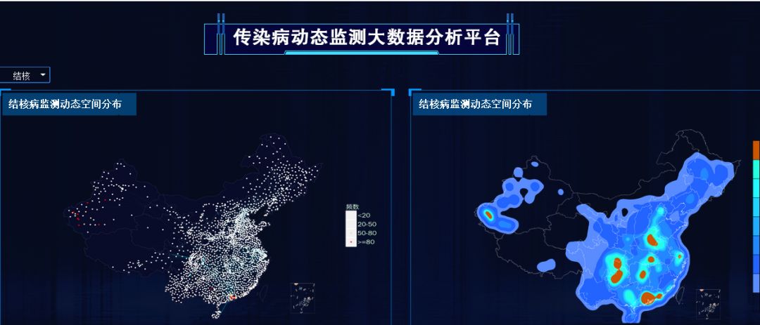 中国疾控中心通过大数据分析技术建立的传染病动态监测大数据分析平台,通过空间分布可监测患者发病分布及流动情况;通过核密度分析可探测传染病聚集性发病的变化情况;通过时间序列及移动百分位数阈值,动态对传染病的发生及时预警。