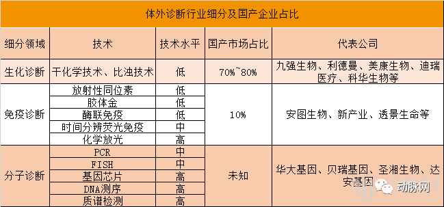具体到细分领域增长趋势中,在国内,体外诊断细分领域主要包括免疫、生化和分子诊断,其中生化诊断和免疫诊断是市场主体,合计占有60%以上的份额。