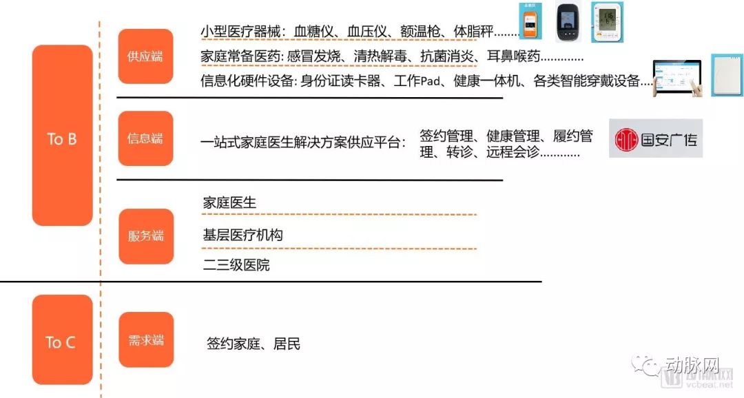 在To B这个层面,供应端主要覆盖小型医疗设备、家庭常备医药及信息化硬件设备;信息端目前主要指整合了多种信息化技术,为家庭医生提供一站式家庭医生解决方案的服务商;在服务端则是提供基层医疗服务的家庭医生、基层医疗机构和二三级医疗机构。而To C的需求端则是接受最终家庭服务的签约家庭/患者。